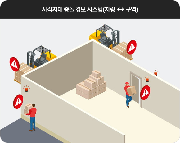 IPAS는 현장 사무실, 창고 입구 등 차량의 움직임을 바로 확인할 수 없는 사각지대에 경광등 타입의 고정형 태그를 설치하여, 보행자 태그를 소지하지 않은 작업자들에게도 차량 접근 정보를 경고하여 충돌 사고를 예방할 수 있습니다.