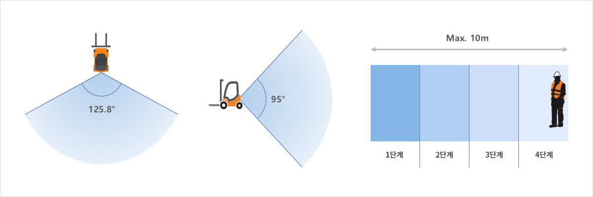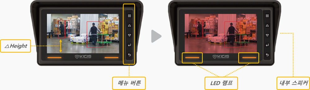 사람 감지 시, 운전원에게 ①모니터 적색화면 점멸 ②LED 램프 점멸 ③경고음 발생(내장 스피커)
