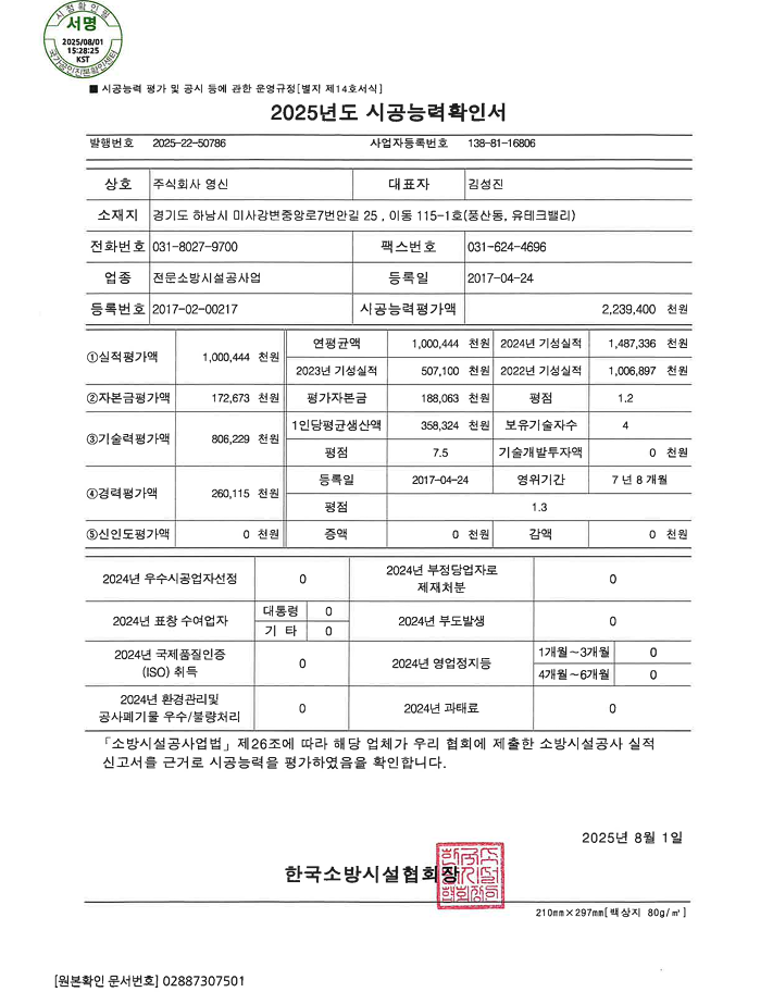 2025년 시공능력평가액 확인서(소방)